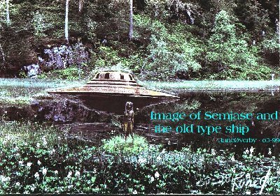 Hun gikk også som en helt vanlig kvinne, men raskere, sikrere og mer grasiøst enn våre jordiske kvinner. Langsomt kom dette vesen fram imot meg, grep tak i min arm, og dro meg opp. Jentas grep var mykt, men bestemt, men dog veldig behagelig, og det overførte en slags trygghetsfølelse. - Med langsomme steg gikk vi til mitt kjøretøy, der vi begge ganske enkelt satte oss ned i det tørre gresset.